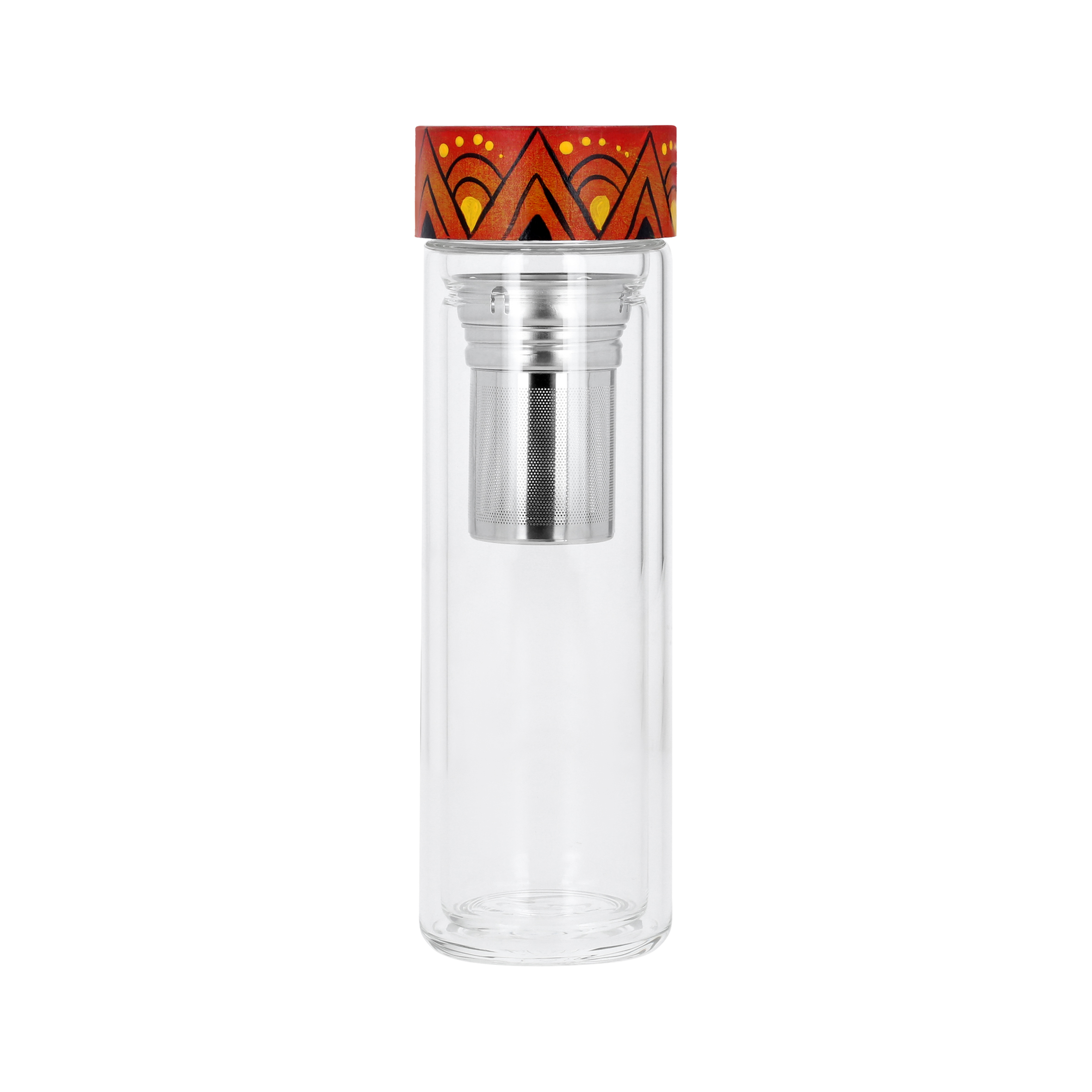 Termo con doble pared de vidrio, infusor de metal y tapa enroscable de bambú. EDICIÓN ALEBRIJE.